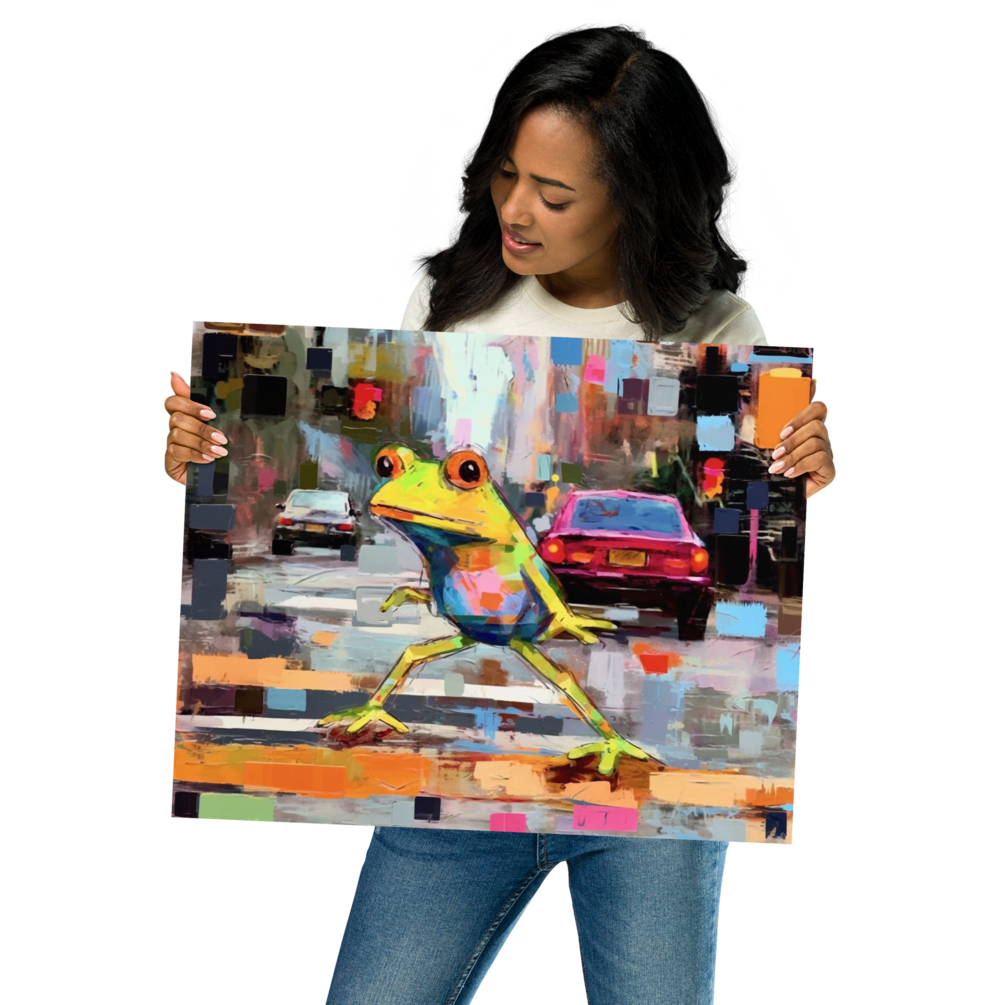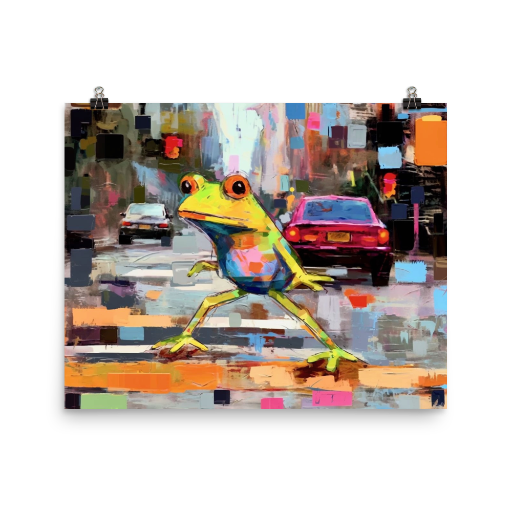 Embark on a daring journey with "Frogger's Escape" – an extraordinary abstract digital illustration that captures the heart-pounding excitement of the classic Frogger video game. Immerse yourself in a world where vibrant colors and abstract shapes intertwine, bringing to life the iconic gameplay that has captivated gamers for decades.